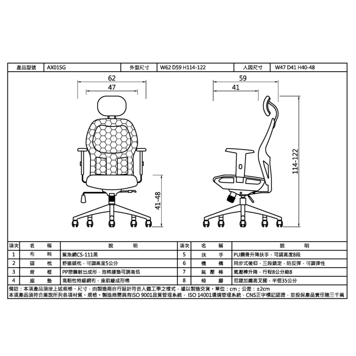 椅背:PP塑鋼射出成形,泡棉腰墊可調高低