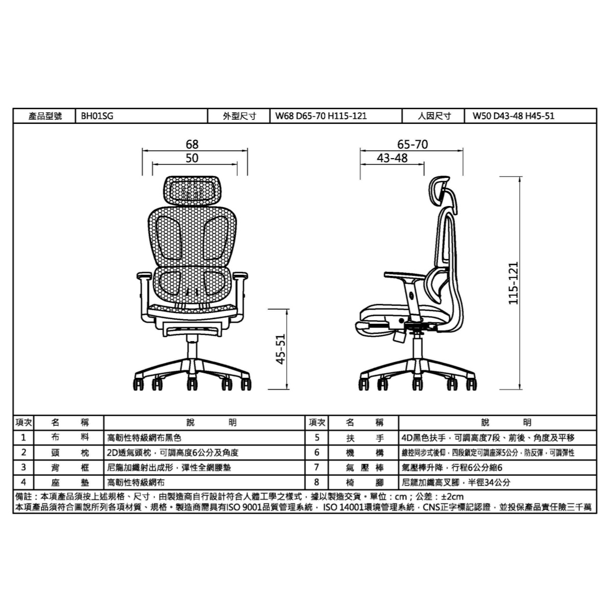 - 人因尺寸:W50 D43-48 H45-51CM