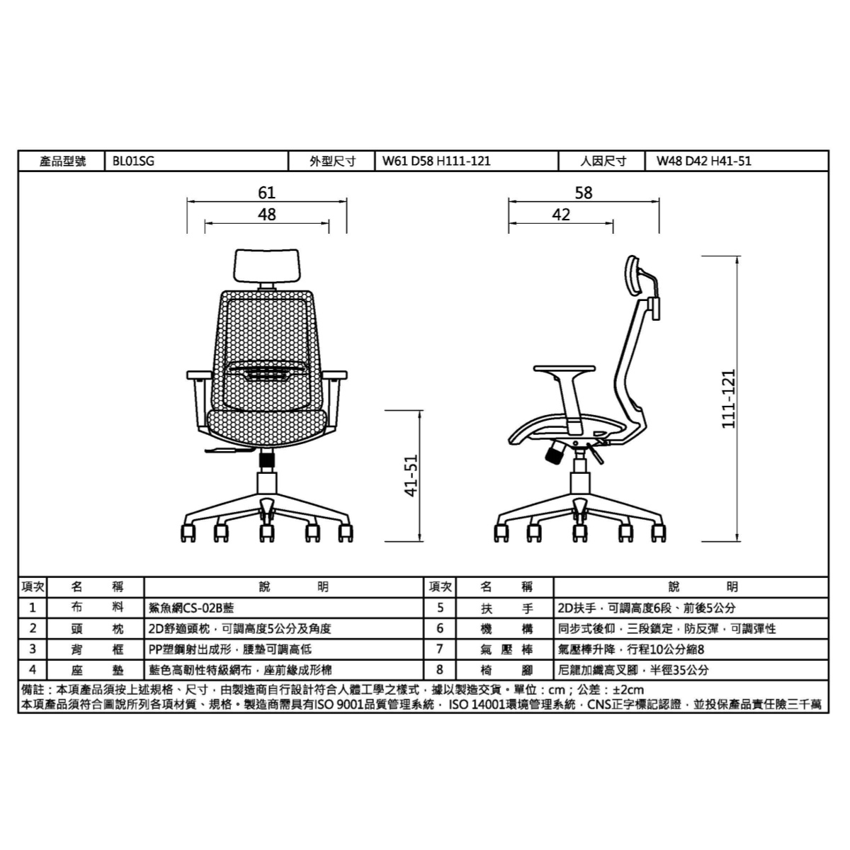 坐墊:藍色高韌性特級網布,座前緣成形棉