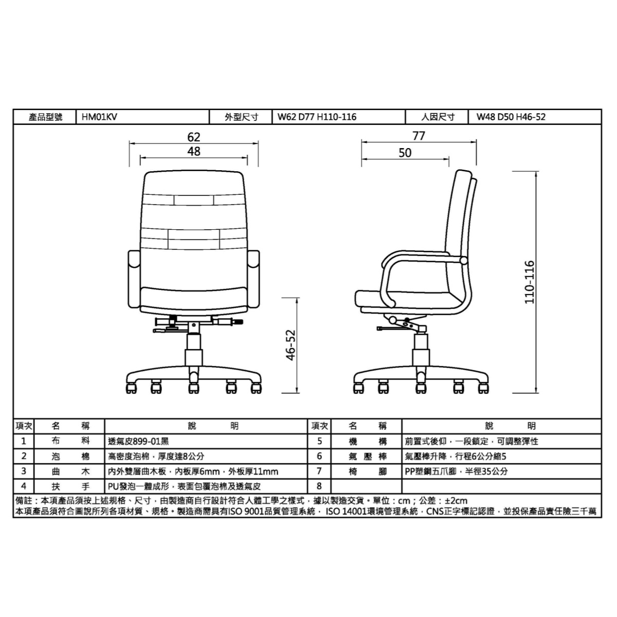 - 外型尺寸:W62 D77 H110-116CM