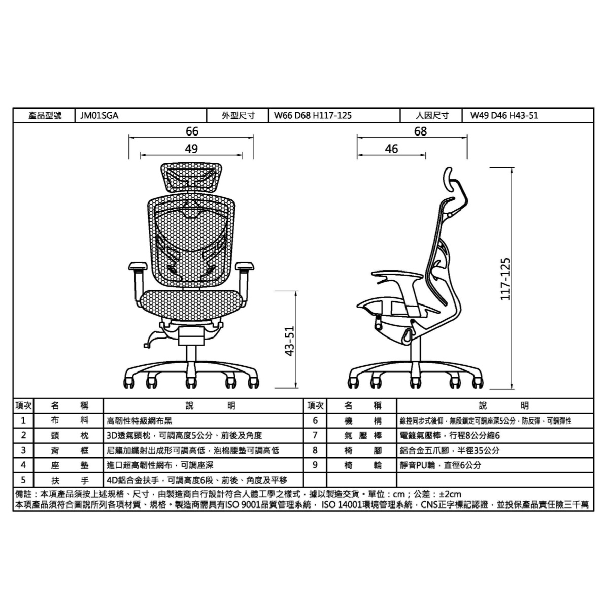- 人因尺寸:W49 D46 H43-51CM