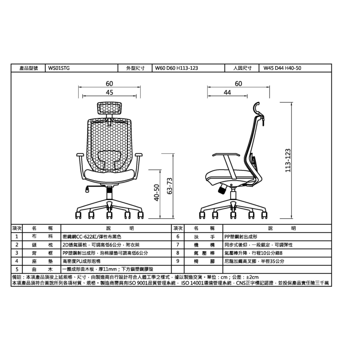 椅背:PP塑鋼射出成形,泡棉腰墊可調高低6公分