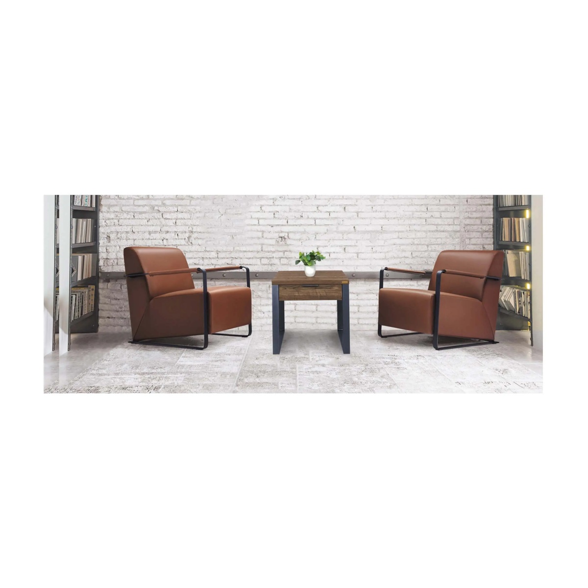- 金莎工業風洽談沙發:棕色皮/黑腳