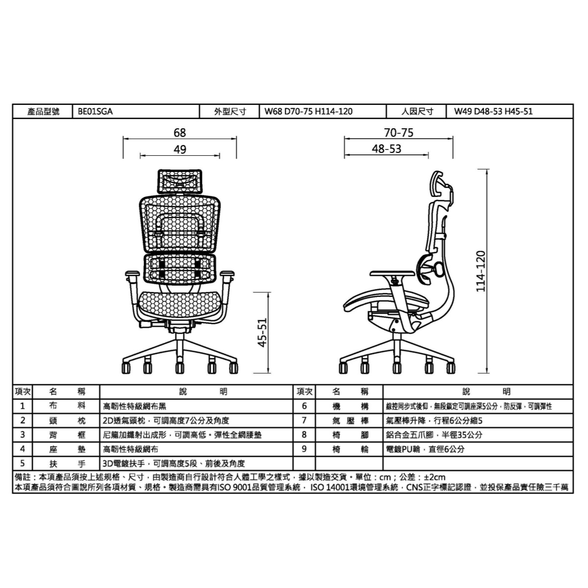 - 外型尺寸:W68 D70-75 H114-120CM