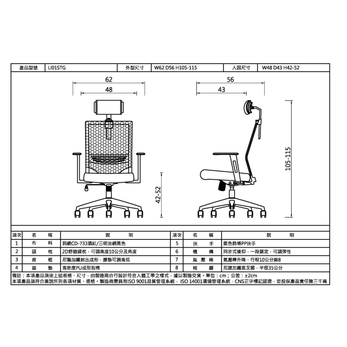 椅背:尼龍加纖射出成形,腰墊可調高低