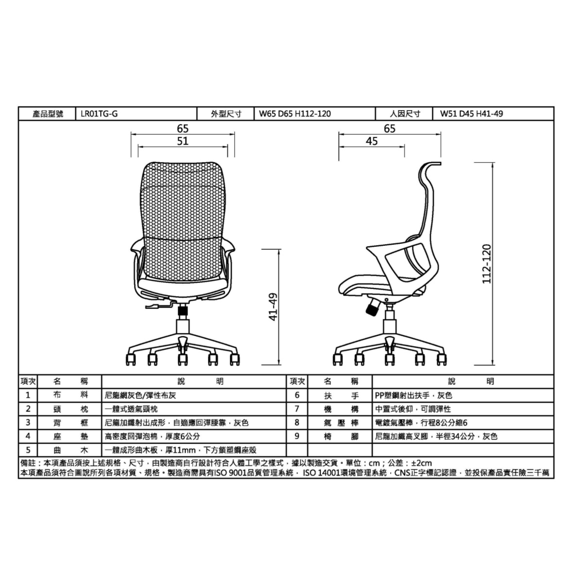 背框:尼龍加纖射出成形,自適應回彈腰靠,灰色