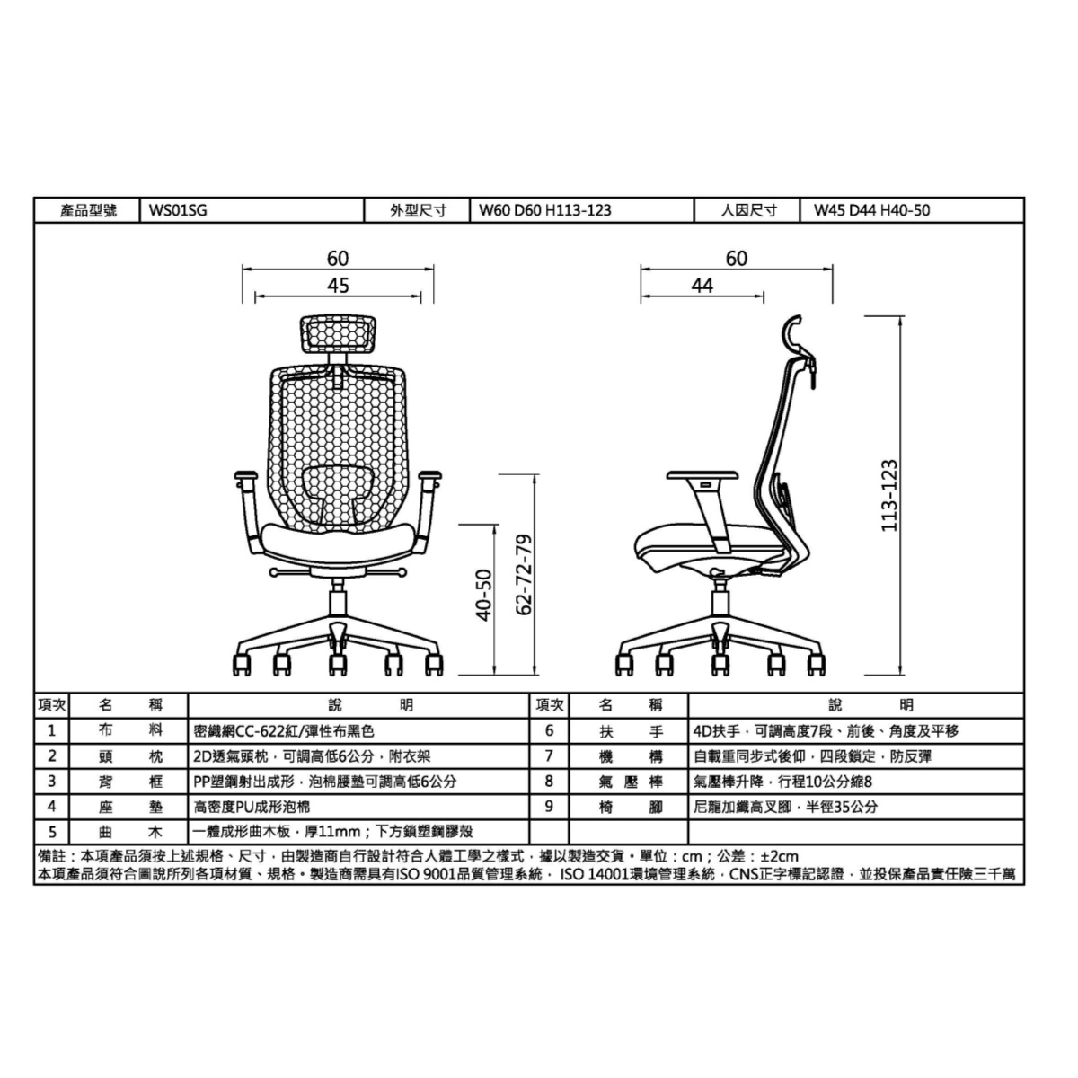 椅背:PP塑鋼射出成形,泡棉腰墊可調高低6公分
